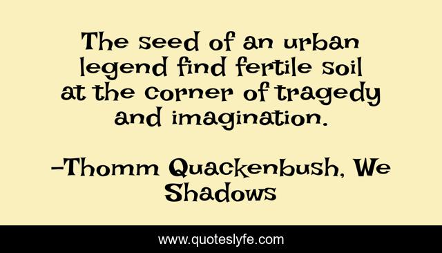 This page presents the quote "The seed of an urban legend find fertile soil at the corner of tragedy and imagination.". Author of this quote is Thomm Quackenbush, We Shadows. This quote is about imagination, urban-legend, urban-legends, tragedy,.