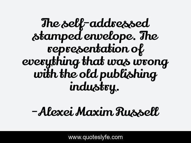 This page presents the quote "The self-addressed stamped envelope. The representation of everything that was wrong with the old publishing industry.". Author of this quote is Alexei Maxim Russell. This quote is about independent, writing-life, publishing, author, indie, quote, writer, publisher, writing,.