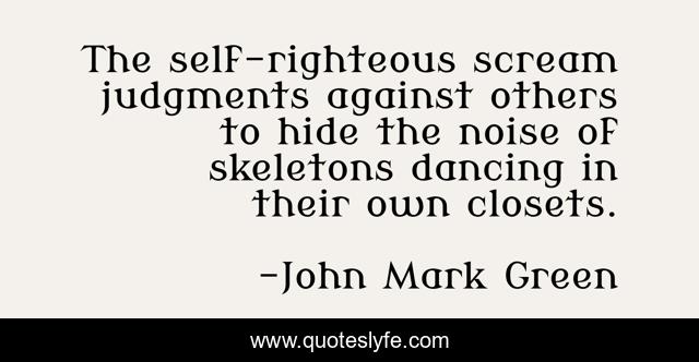 This page presents the quote "The self-righteous scream judgments against others to hide the noise of skeletons dancing in their own closets.". Author of this quote is John Mark Green. This quote is about hypocrisy, hypocrites-judge, judgmental, hypocrites, scream, judging-others, skeletons-in-the-closet,.