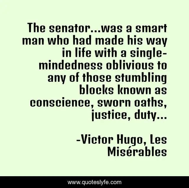 This page presents the quote "The senator...was a smart man who had made his way in life with a single-mindedness oblivious to any of those stumbling blocks known as conscience, sworn oaths, justice, duty...". Author of this quote is Victor Hugo, Les Misérables. .