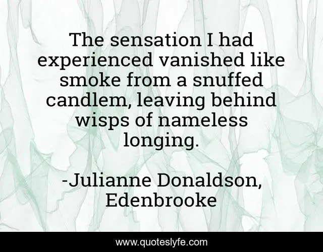 This page presents the quote "The sensation I had experienced vanished like smoke from a snuffed candlem, leaving behind wisps of nameless longing.". Author of this quote is Julianne Donaldson, Edenbrooke. .