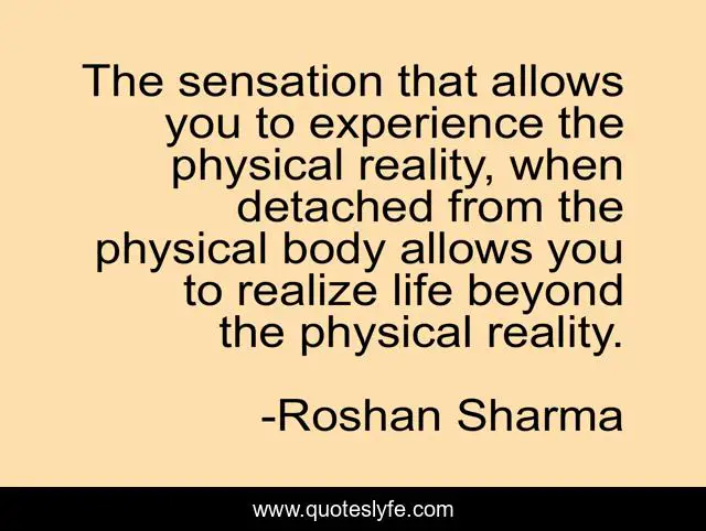This page presents the quote "The sensation that allows you to experience the physical reality, when detached from the physical body allows you to realize life beyond the physical reality.". Author of this quote is Roshan Sharma. This quote is about spiritual-experience, sensation, reality, detachment, subtle, astral,.