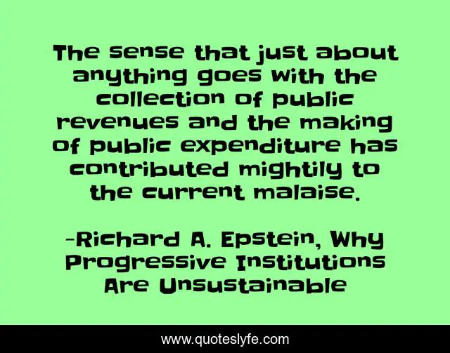 This page presents the quote "The sense that just about anything goes with the collection of public revenues and the making of public expenditure has contributed mightily to the current malaise.". Author of this quote is Richard A. Epstein, Why Progressive Institutions Are Unsustainable. This quote is about liberal, finance, progressive, government, conservative, state, libertarian, politics,.