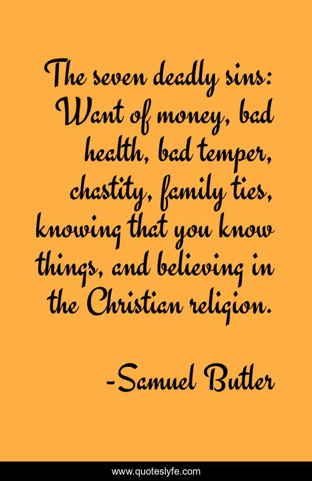 This page presents the quote "The seven deadly sins: Want of money, bad health, bad temper, chastity, family ties, knowing that you know things, and believing in the Christian religion.". Author of this quote is Samuel Butler. This quote is about money, health, family,.