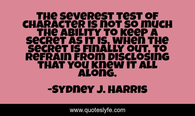 This page presents the quote "The severest test of character is not so much the ability to keep a secret as it is, when the secret is finally out, to refrain from disclosing that you knew it all along.". Author of this quote is Sydney J. Harris. This quote is about character, secret, humor,.