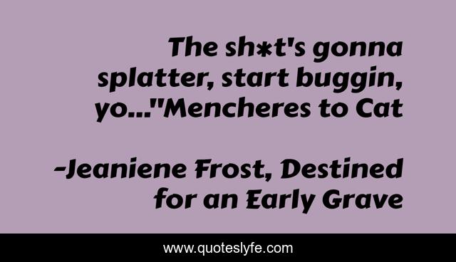 This page presents the quote "The sh*t's gonna splatter, start buggin, yo..."Mencheres to Cat". Author of this quote is Jeaniene Frost, Destined for an Early Grave. This quote is about bones, humor, cat,.