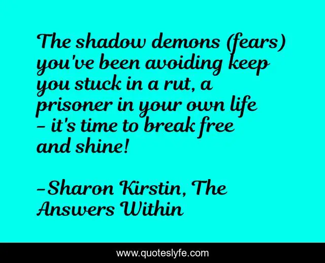 This page presents the quote "The shadow demons (fears) you've been avoiding keep you stuck in a rut, a prisoner in your own life - it's time to break free and shine!". Author of this quote is Sharon Kirstin, The Answers Within. This quote is about motivation, personal-power, positive, motivational, confidence, wisdom, spiritual-power, spirituality, optimistic,.