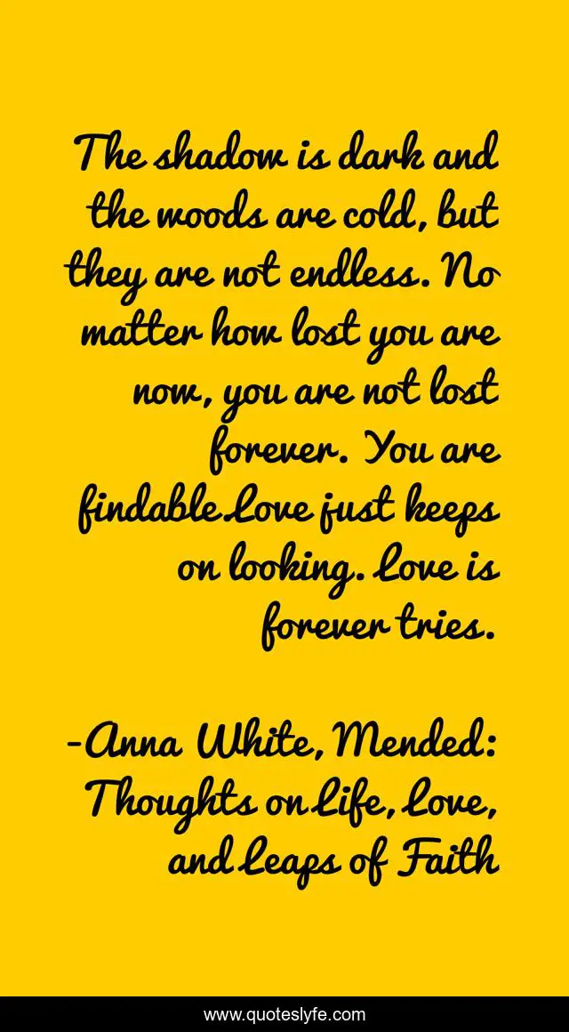 This page presents the quote "The shadow is dark and the woods are cold, but they are not endless. No matter how lost you are now, you are not lost forever. You are findable.Love just keeps on looking. Love is forever tries.". Author of this quote is Anna White, Mended: Thoughts on Life, Love, and Leaps of Faith. This quote is about faith, love, darkness, lost, personal-growth, searching, christianity, depression, inspirational,.