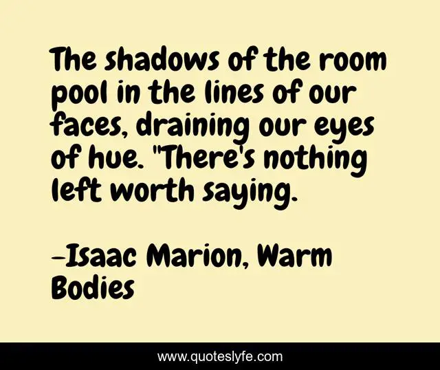 This page presents the quote "The shadows of the room pool in the lines of our faces, draining our eyes of hue. "There's nothing left worth saying.". Author of this quote is Isaac Marion, Warm Bodies. This quote is about nothing, shadows, eyes,.