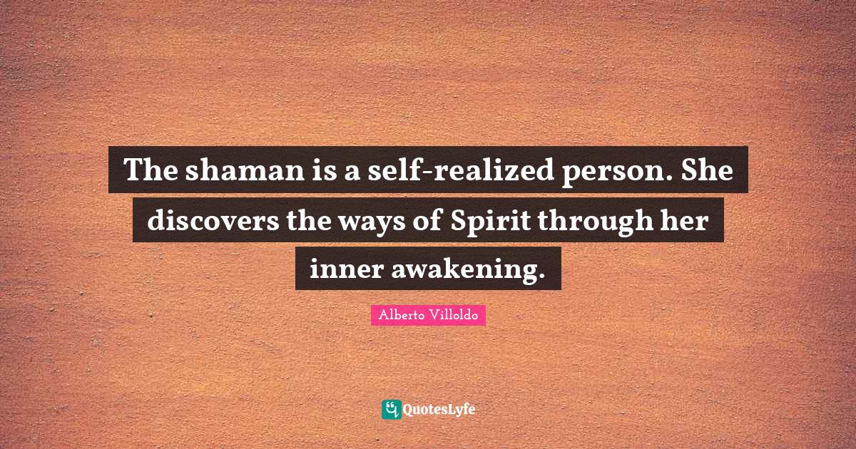 This page presents the quote "The shaman is a self-realized person. She discovers the ways of Spirit through her inner awakening.". Author of this quote is Alberto Villoldo. This quote is about spirit, self, way, awakening,.
