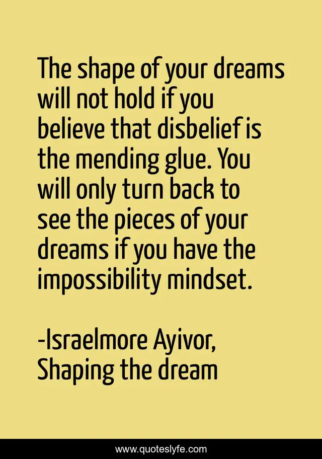 This page presents the quote "The shape of your dreams will not hold if you believe that disbelief is the mending glue. You will only turn back to see the pieces of your dreams if you have the impossibility mindset.". Author of this quote is Israelmore Ayivor, Shaping the dream. This quote is about impossibility, food-for-thought, disbelief, shape, mindset, pieces, shape-the-dream, turn, disbelieve,.