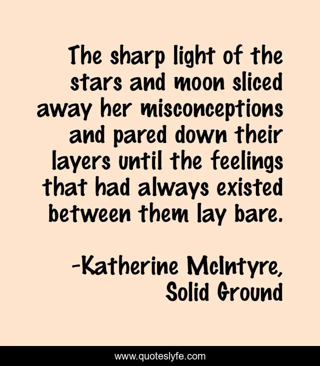 This page presents the quote "The sharp light of the stars and moon sliced away her misconceptions and pared down their layers until the feelings that had always existed between them lay bare.". Author of this quote is Katherine McIntyre, Solid Ground. This quote is about longing, regret, feelings, moonlight, shared-feelings, misconceptions,.