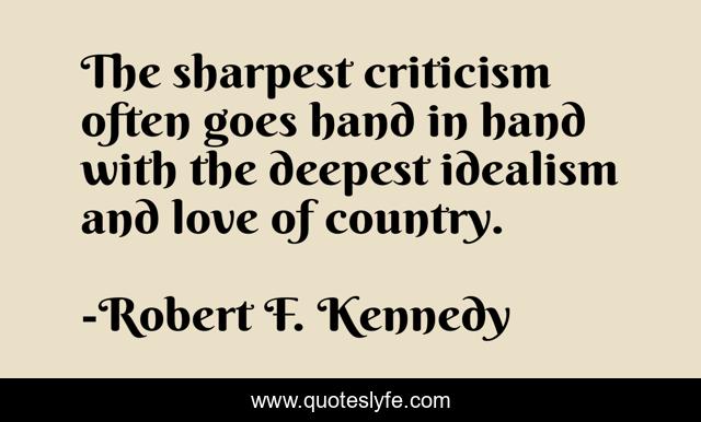 This page presents the quote "The sharpest criticism often goes hand in hand with the deepest idealism and love of country.". Author of this quote is Robert F. Kennedy. This quote is about politics, inspirational, enthusiasm,.