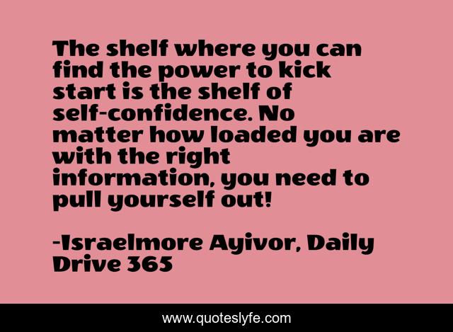 This page presents the quote "The shelf where you can find the power to kick start is the shelf of self-confidence. No matter how loaded you are with the right information, you need to pull yourself out!". Author of this quote is Israelmore Ayivor, Daily Drive 365. This quote is about information, food-for-thought, kick-start, pull-yourself, israelmore-ayivor, power, drag-yourself, shelf, self-awareness,.