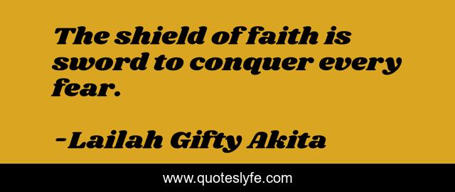This page presents the quote "The shield of faith is sword to conquer every fear.". Author of this quote is Lailah Gifty Akita. This quote is about faith, christian-life, fear, inspirational, enthusiasm,.
