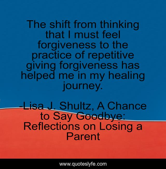 This page presents the quote "The shift from thinking that I must feel forgiveness to the practice of repetitive giving forgiveness has helped me in my healing journey.". Author of this quote is Lisa J. Shultz, A Chance to Say Goodbye: Reflections on Losing a Parent. This quote is about healing-the-past, forgiveness, healing, shift-in-perspective,.