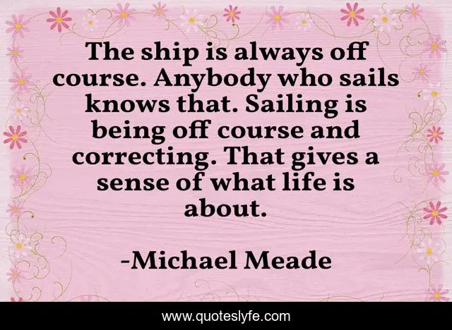 This page presents the quote "The ship is always off course. Anybody who sails knows that. Sailing is being off course and correcting. That gives a sense of what life is about.". Author of this quote is Michael Meade. This quote is about navigating-change, change, journey-of-life,.