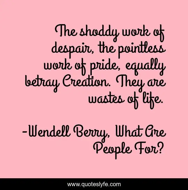 This page presents the quote "The shoddy work of despair, the pointless work of pride, equally betray Creation. They are wastes of life.". Author of this quote is Wendell Berry, What Are People For?. .