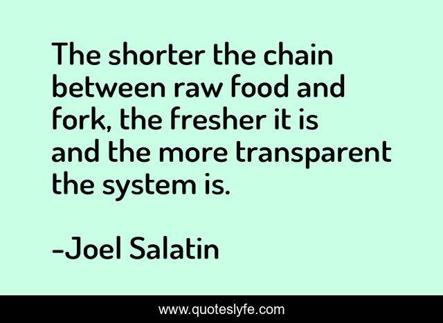 This page presents the quote "The shorter the chain between raw food and fork, the fresher it is and the more transparent the system is.". Author of this quote is Joel Salatin. This quote is about fork, system, chain,.