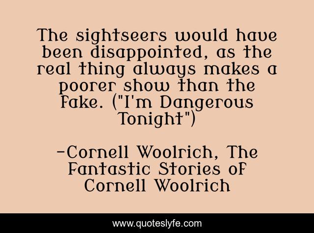 This page presents the quote "The sightseers would have been disappointed, as the real thing always makes a poorer show than the fake. ("I'm Dangerous Tonight")". Author of this quote is Cornell Woolrich, The Fantastic Stories of Cornell Woolrich. This quote is about artifice, authenticity, fake,.