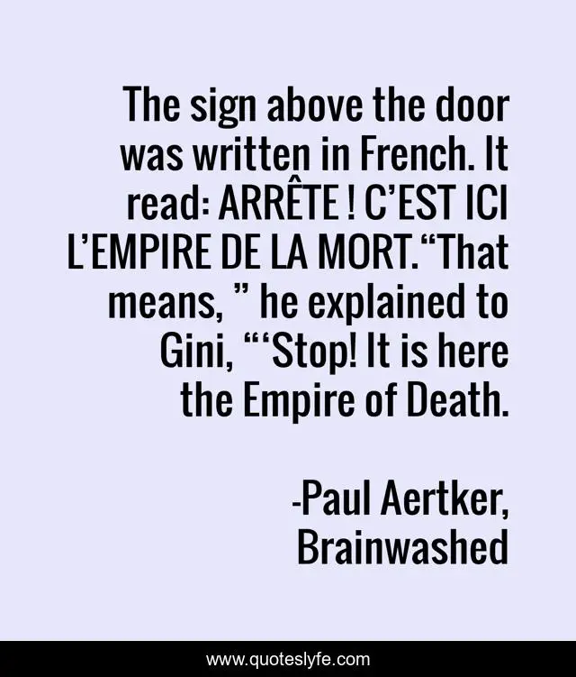 This page presents the quote "The sign above the door was written in French. It read: ARRÊTE ! C’EST ICI L’EMPIRE DE LA MORT.“That means, ” he explained to Gini, “‘Stop! It is here the Empire of Death.". Author of this quote is Paul Aertker, Brainwashed. This quote is about catacombs, kid-books, spy-vs-spy, paris, middle-grade-series, spy-kids,.