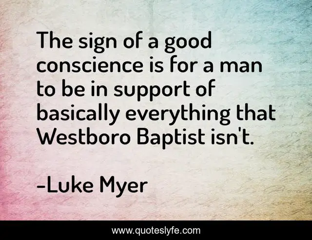 This page presents the quote "The sign of a good conscience is for a man to be in support of basically everything that Westboro Baptist isn't.". Author of this quote is Luke Myer. This quote is about conscience, humour, morals, philosophy, principles, ethics, humanity, morality,.