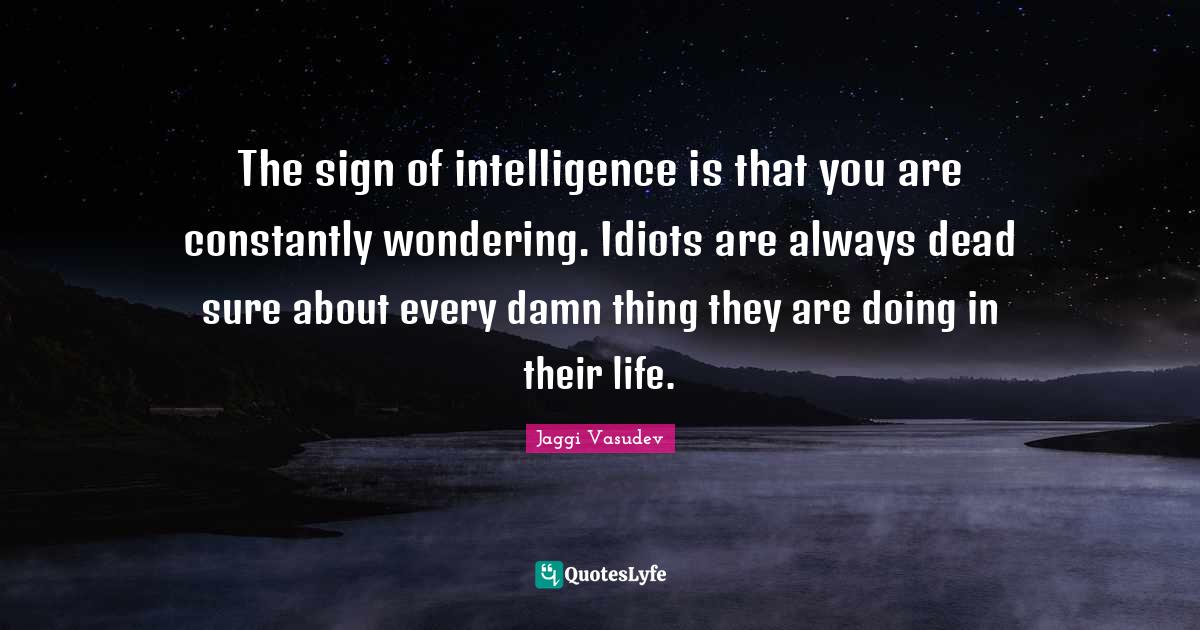 This page presents the quote "The sign of intelligence is that you are constantly wondering. Idiots are always dead sure about every damn thing they are doing in their life.". Author of this quote is Jaggi Vasudev. This quote is about life, stupid people, damn, intelligence, idiot,.