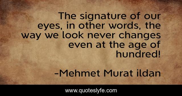 This page presents the quote "The signature of our eyes, in other words, the way we look never changes even at the age of hundred!". Author of this quote is Mehmet Murat ildan. This quote is about eyes, mehmet-murat-ildan, age, signature, hundred, changes, change, the-way-we-look,.
