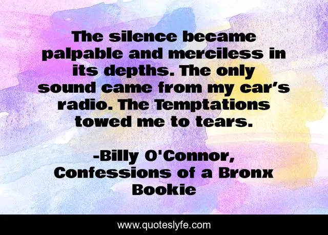 This page presents the quote "The silence became palpable and merciless in its depths. The only sound came from my car’s radio. The Temptations towed me to tears.". Author of this quote is Billy O'Connor, Confessions of a Bronx Bookie. This quote is about quote, billy-o-connor, confessions-of-a-bronx-bookie,.