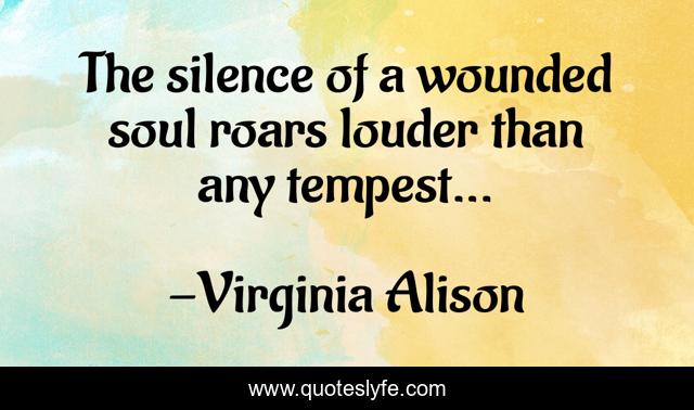 This page presents the quote "The silence of a wounded soul roars louder than any tempest...". Author of this quote is Virginia Alison. This quote is about roar, silence, soul, wounded-soul, tempest,.