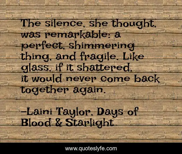 This page presents the quote "The silence, she thought, was remarkable: a perfect, shimmering thing, and fragile. Like glass, if it shattered, it would never come back together again.". Author of this quote is Laini Taylor, Days of Blood & Starlight. .