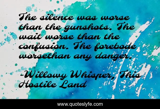 This page presents the quote "The silence was worse than the gunshots. The wait worse than the confusion. The forebode worsethan any danger.". Author of this quote is Willowy Whisper, This Hostile Land. This quote is about nervousness, danger, fiction, forebode, western, fear, silence, wait,.