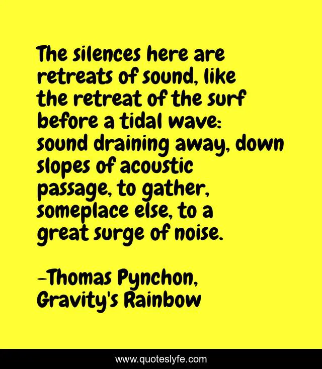 This page presents the quote "The silences here are retreats of sound, like the retreat of the surf before a tidal wave: sound draining away, down slopes of acoustic passage, to gather, someplace else, to a great surge of noise.". Author of this quote is Thomas Pynchon, Gravity's Rainbow. This quote is about life, silence,.