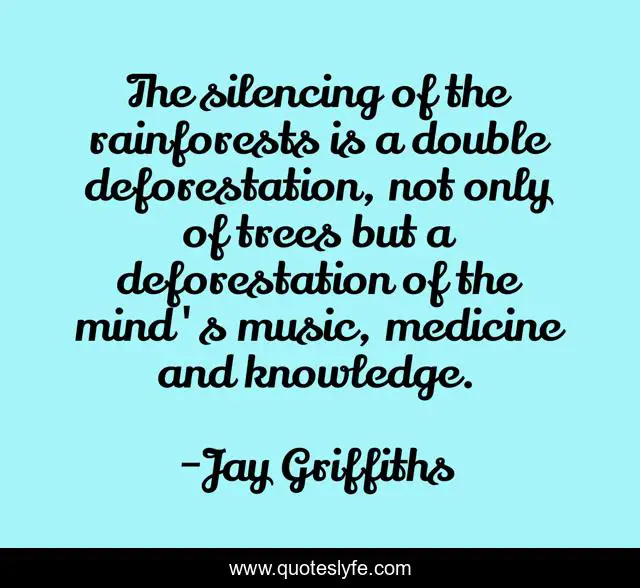 This page presents the quote "The silencing of the rainforests is a double deforestation, not only of trees but a deforestation of the mind's music, medicine and knowledge.". Author of this quote is Jay Griffiths. This quote is about music, mind, trees,.