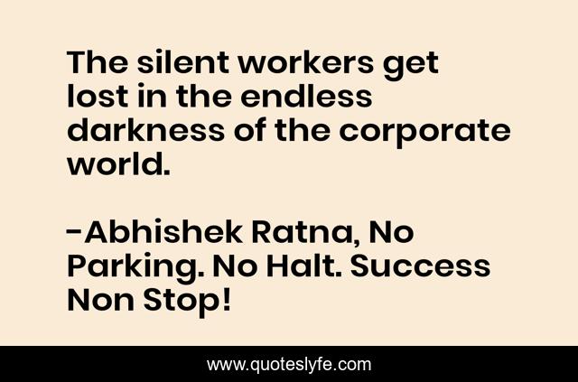 This page presents the quote "The silent workers get lost in the endless darkness of the corporate world.". Author of this quote is Abhishek Ratna, No Parking. No Halt. Success Non Stop!. This quote is about corporate-world, silent-worker, success, career, career-development, success-self-improvement, worker, corporate-ethics, visibility,.