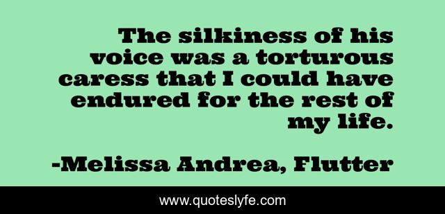 This page presents the quote "The silkiness of his voice was a torturous caress that I could have endured for the rest of my life.". Author of this quote is Melissa Andrea, Flutter. This quote is about life, silk, silkiness, torture, love-story, love-hurts, love, voice, affection,.