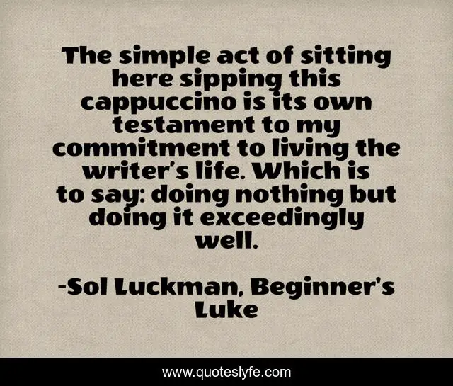 This page presents the quote "The simple act of sitting here sipping this cappuccino is its own testament to my commitment to living the writer’s life. Which is to say: doing nothing but doing it exceedingly well.". Author of this quote is Sol Luckman, Beginner's Luke. This quote is about coffee, cappuccino, humor, observation, writer, cafe, inaction,.