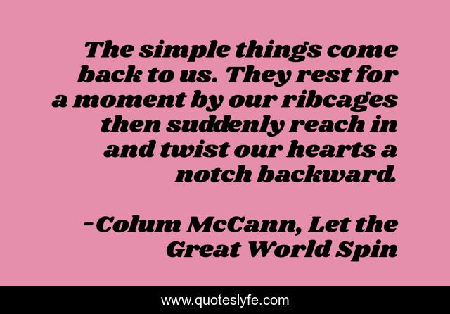 This page presents the quote "The simple things come back to us. They rest for a moment by our ribcages then suddenly reach in and twist our hearts a notch backward.". Author of this quote is Colum McCann, Let the Great World Spin. .