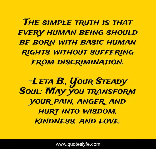 This page presents the quote "The simple truth is that every human being should be born with basic human rights without suffering from discrimination.". Author of this quote is Leta B., Your Steady Soul: May you transform your pain, anger, and hurt into wisdom, kindness, and love.. This quote is about human-rights, humanity,.