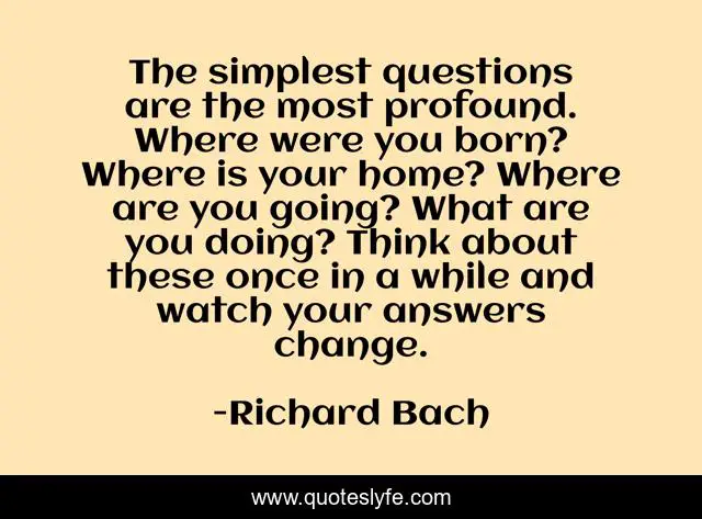 This page presents the quote "The simplest questions are the most profound. Where were you born? Where is your home? Where are you going? What are you doing? Think about these once in a while and watch your answers change.". Author of this quote is Richard Bach. This quote is about home, think, questions,.