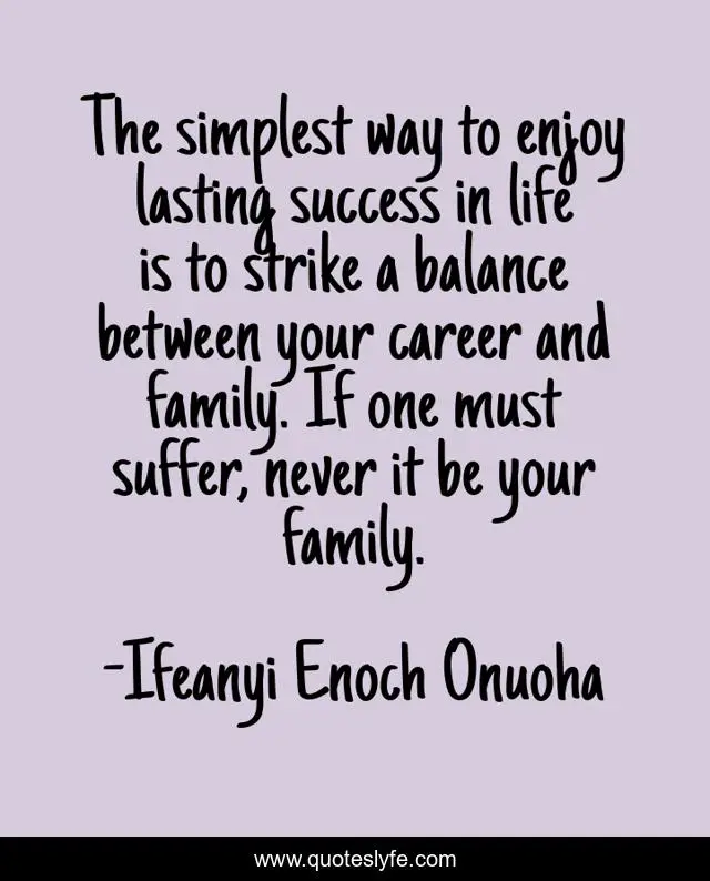 This page presents the quote "The simplest way to enjoy lasting success in life is to strike a balance between your career and family. If one must suffer, never it be your family.". Author of this quote is Ifeanyi Enoch Onuoha. This quote is about hinovelty, family, career, life-coach, ifeanyi-enoch-onuoha, quotes, successful-relationship, relationship,.