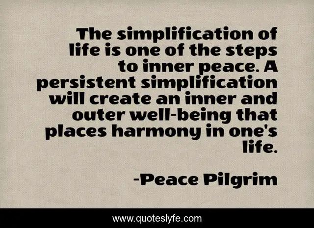 This page presents the quote "The simplification of life is one of the steps to inner peace. A persistent simplification will create an inner and outer well-being that places harmony in one's life.". Author of this quote is Peace Pilgrim. This quote is about life, well-being, harmony,.