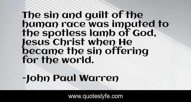 This page presents the quote "The sin and guilt of the human race was imputed to the spotless lamb of God, Jesus Christ when He became the sin offering for the world.". Author of this quote is John Paul Warren. This quote is about gospel, grace, jospeh-prince, pastor-john-paul-warren,.