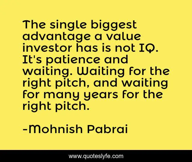 This page presents the quote "The single biggest advantage a value investor has is not IQ. It's patience and waiting. Waiting for the right pitch, and waiting for many years for the right pitch.". Author of this quote is Mohnish Pabrai. This quote is about waiting, single, value,.