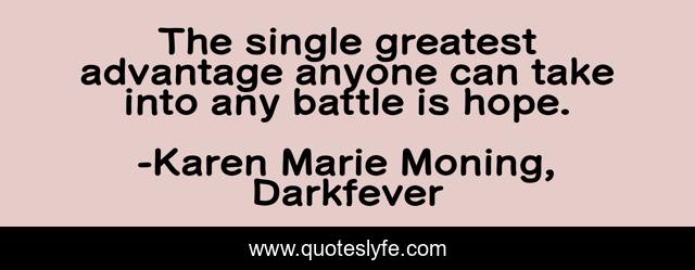 This page presents the quote "The single greatest advantage anyone can take into any battle is hope.". Author of this quote is Karen Marie Moning, Darkfever. This quote is about battle, enthusiasm, hope, inspirational,.