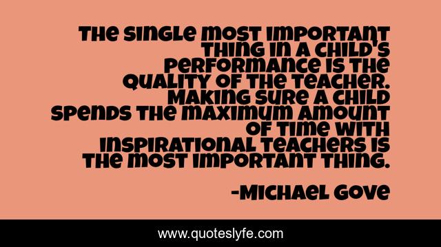 This page presents the quote "The single most important thing in a child's performance is the quality of the teacher. Making sure a child spends the maximum amount of time with inspirational teachers is the most important thing.". Author of this quote is Michael Gove. This quote is about time, teacher, child,.