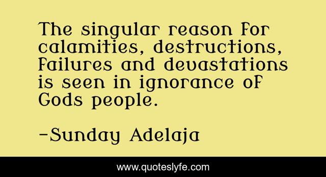 This page presents the quote "The singular reason for calamities, destructions, failures and devastations is seen in ignorance of Gods people.". Author of this quote is Sunday Adelaja. This quote is about devastation, singular, calamities, god, ignorance, poeple, reason, failures, destruction,.