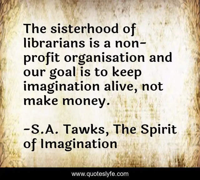 This page presents the quote "The sisterhood of librarians is a non-profit organisation and our goal is to keep imagination alive, not make money.". Author of this quote is S.A. Tawks, The Spirit of Imagination. This quote is about spirituality, author, writing, imagination, reader, reading,.