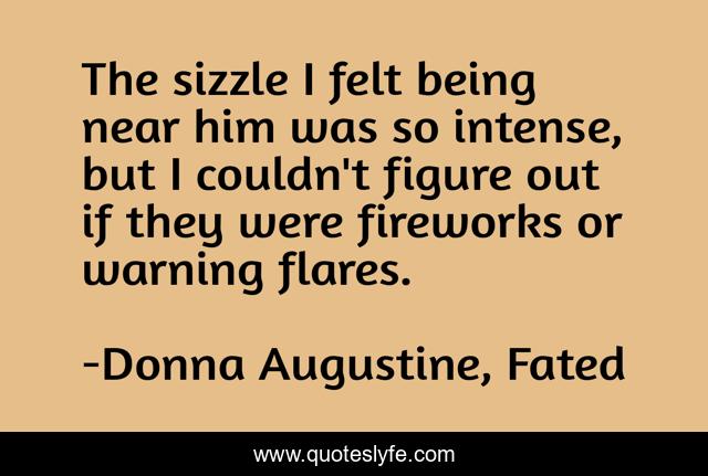 This page presents the quote "The sizzle I felt being near him was so intense, but I couldn't figure out if they were fireworks or warning flares.". Author of this quote is Donna Augustine, Fated. This quote is about urban-fantasy, paranormal-romance,.