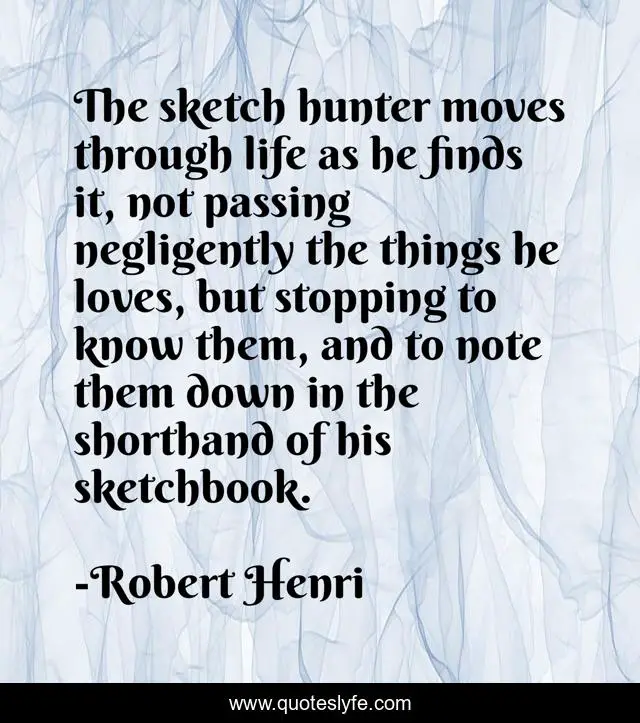 This page presents the quote "The sketch hunter moves through life as he finds it, not passing negligently the things he loves, but stopping to know them, and to note them down in the shorthand of his sketchbook.". Author of this quote is Robert Henri. .